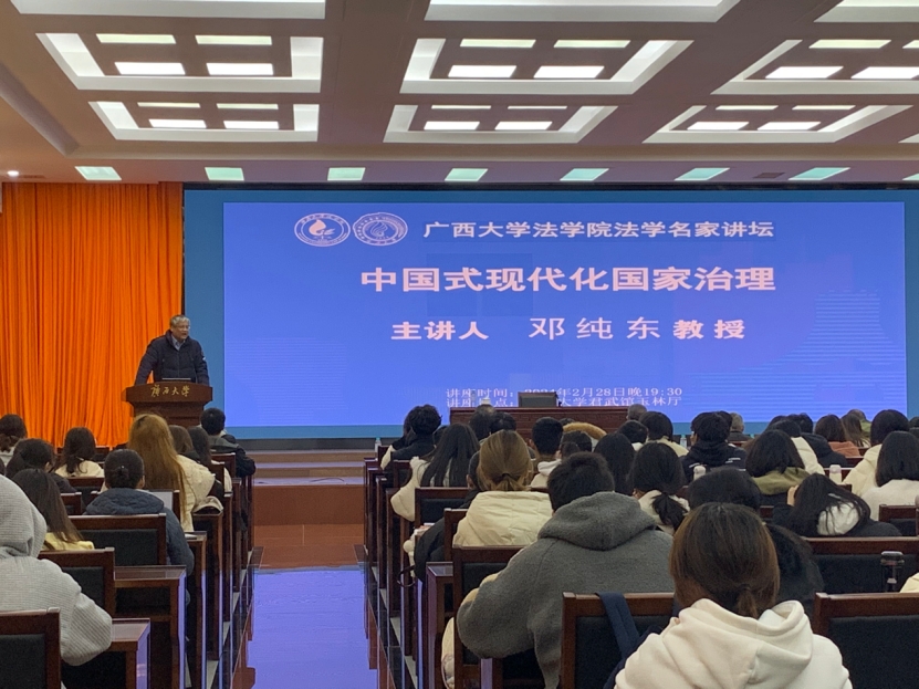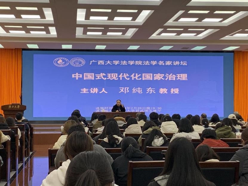 2月28日,第十三届全国政协委员、全国政协社会和法制委员会委员、中国政策科学研究会副会长邓纯东应邀在君武馆玉林厅作主题为“中国式现代化国家治理”的讲座。本次讲座由星空XK体育院长许光耀主持,星空XK体育本科生、硕士研究生参加了此次讲座。