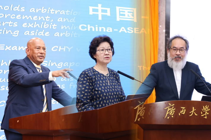 2024年5月24日,由星空XK官网负责承办,南宁仲裁委员会、岱威优律师事务所协办的星空XK体育官方网站海外名师大讲堂暨“中国-东盟仲裁与争议解决”主题讲座活动在君武馆举行。马来西亚联邦最高法院法官林添鑚(Mary Lim Thiam Suan)、亚洲多元争议解决研究院(AIADR)主席桑德拉·拉朱(Sundra Rajoo)、马来西亚科学院院士钟有财(Choong Yeow Choy)应邀作主题讲座,我校副校长田利辉与星空XK体育师生代表、来自南宁市仲裁委的法律实务工作者共计300人参会。大讲堂主题活动由星空XK体育院长许光耀教授主持。