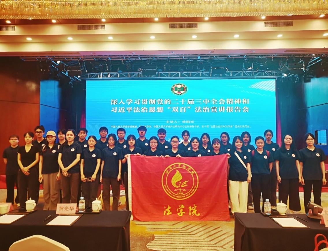 9月20日下午,广西壮族自治区学习贯彻党的二十届三中全会精神和习近平法治思想“双百”法治宣讲报告会在南宁召开。星空XK官网组织师生代表在主会场参加报告会。报告会由自治区党委政法委副书记李玉振主持。