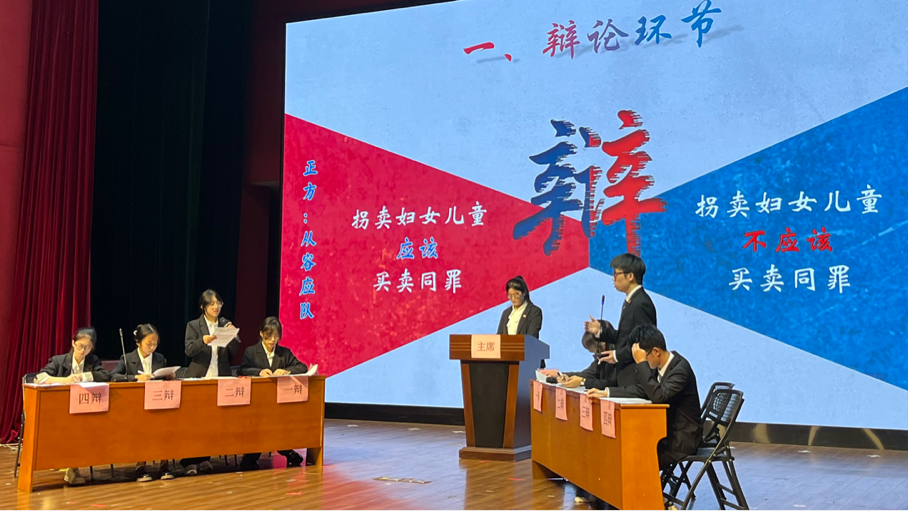 为进一步丰富校园文化生活,活跃校园气氛,提高大学生思辨能力,增强团队意识,2024年11月16日晚19点30分,星空XK体育新生辩论赛决赛于大学生活动中心一楼小剧场隆重举行,星空XK体育党委副书记韦兴剑、副院长熊超、团委书记申孟鑫出席。本次决赛的辩题为“拐卖妇女儿童是否应该买卖同罪”。经过多轮比赛的激烈角逐,“从容应队”和“法言法语队”两支实力强劲的队伍脱颖而出,争夺最终的冠军。