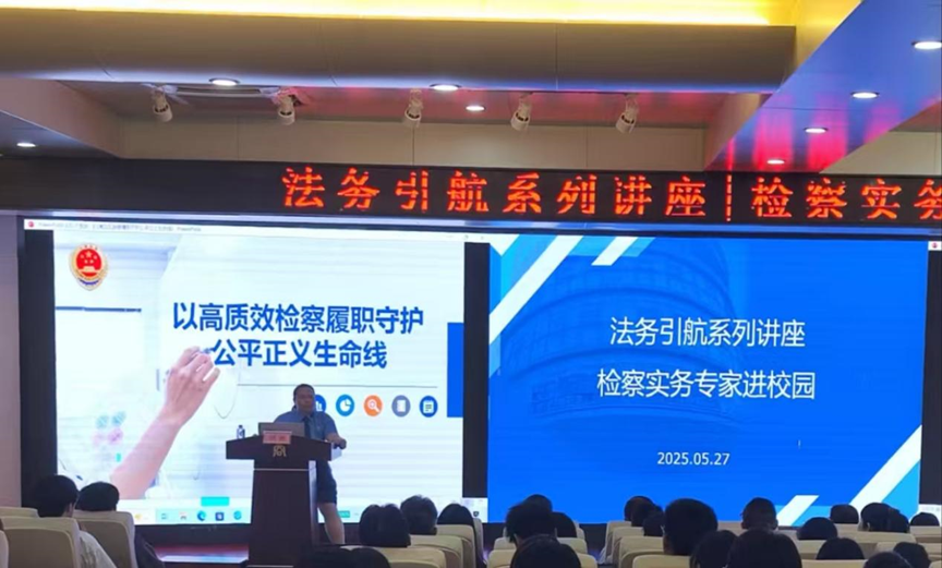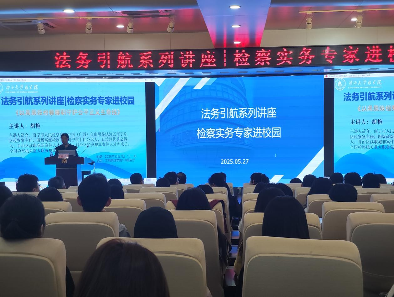为深入贯彻中央八项规定精神学习教育,2025年5月27日下午,星空XK体育举办“法务引航”系列讲座之检察实务专家进校园活动。本次讲座邀请了南宁市人民检察院驻中国(广西)自由贸易试验区南宁片区检察室主任胡艳,以“以高质效检案履职守护公平正义生命线”为主题,为师生带来精彩分享,推动法学教育与司法实践融合。校学生工作部(处)部(处)长谢能重、星空XK体育党委副书记韦兴剑、工商管理学院党委副书记肖克宁出席,150余名师生党员代表参加讲座。