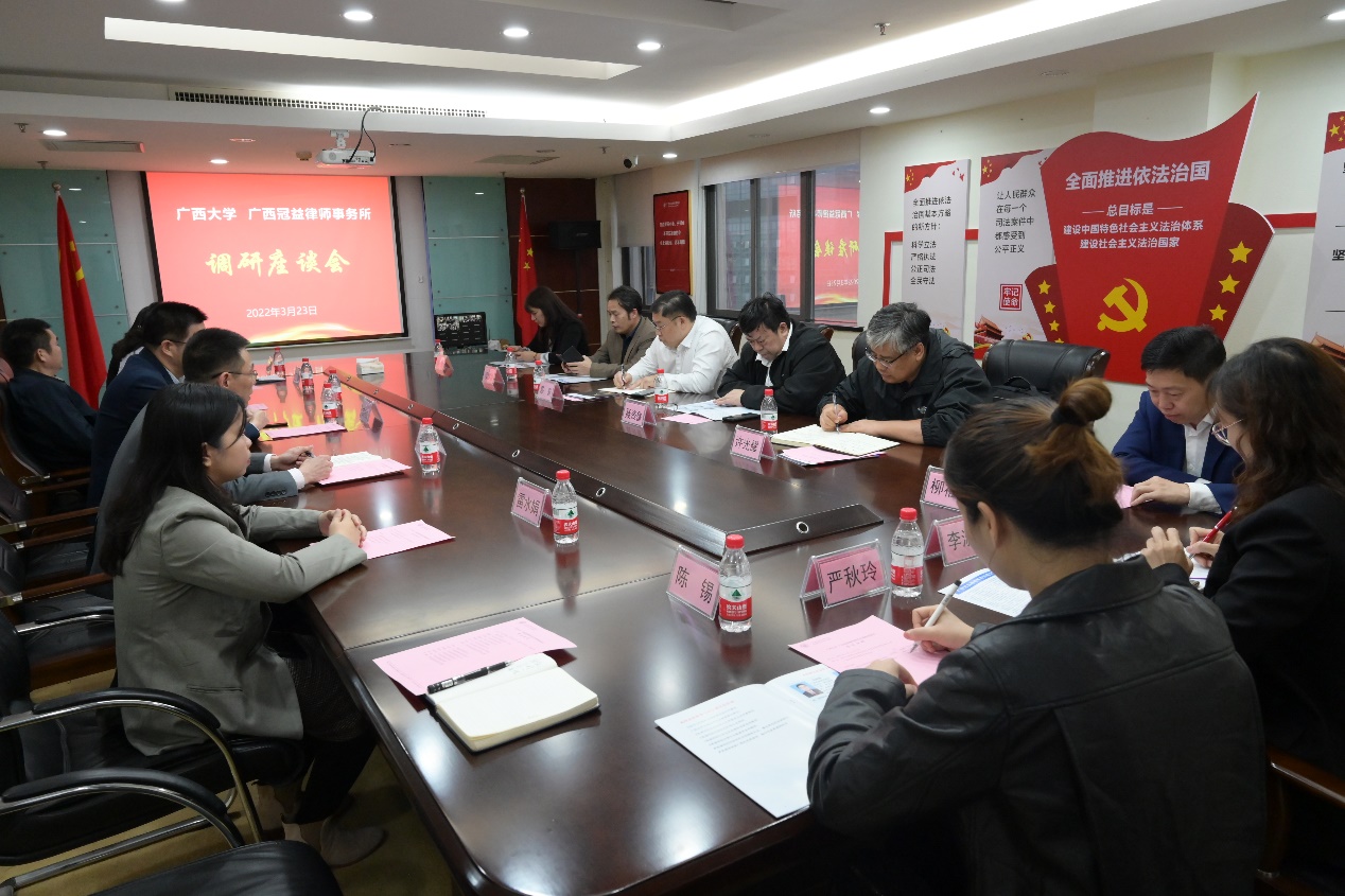 3月23日,星空XK官网院长聂资鲁与星空XK体育官方网站校友工作办公室主任、校友总会秘书长、校教育发展基金会秘书长陈聚带队到广西冠益律师事务所开展“产学研”调研交流活动,签订捐赠协议,举行“涉东盟高端法律人才培养基地”挂牌仪式,并与冠益所主任吕伟良校友、党委书记毛青松、执行主任苏拥政校友等座谈。