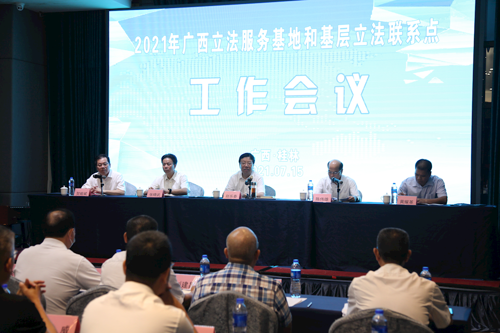 2021年7月15日,“2021年广西立法服务基地和基层立法联系点工作会议”在桂林市召开。会议以习近平法治思想为指引,深入开展立法服务基地和基层立法联系点工作交流,并对今后工作进行安排部署,以便为我区地方立法工作提供智力支持。自治区人大常委会副主任赵乐秦,自治区人大常委会法工委主任陈伟雄、副主任黄耀革,我校校务委员张永成以及其他单位领导等出席会议。